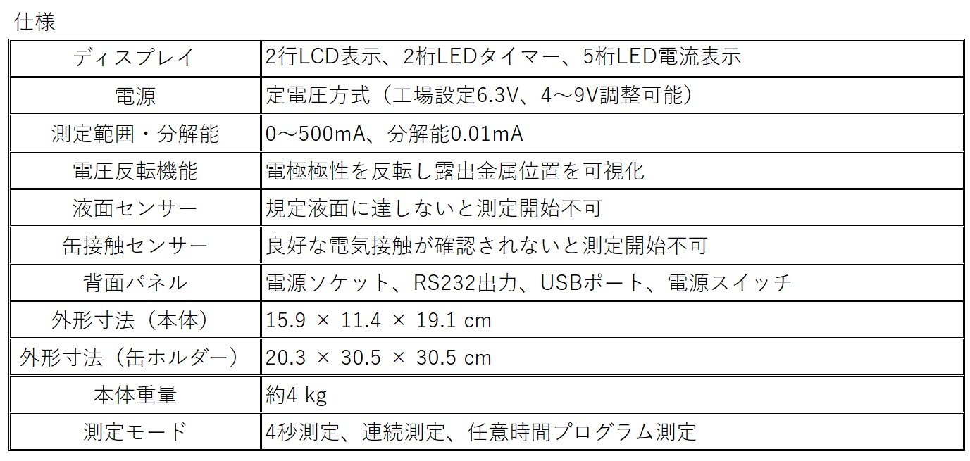 さらに、電圧反転機能により露出金属部を視覚的に確認することが可能です。液面センサーおよび缶接触センサーを備え、適切な条件が満たされた場合のみ測定を開始する安全設計を採用しています。USBおよびRS232インターフェースを標準装備し、外部機器との接続やデータ管理にも対応します。