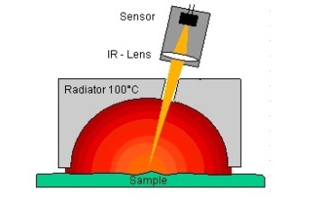 一定に加熱された半球上の黒色ボディからの輻射熱により、サンプル表面に均一に熱を放射し、サンプルからの反射熱と校正用部材の熱反射量の比較により、熱放射率を測定いたします。