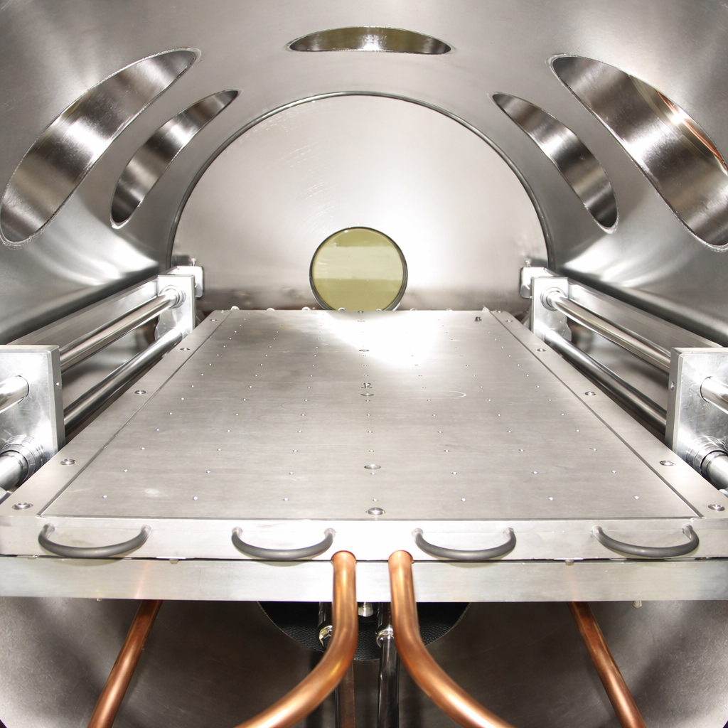 本装置は、宇宙環境を地上で高精度に再現するために設計された熱真空シミュレーションチャンバーです。高性能ターボ分子ポンプとドライスクロールポンプを組み合わせることで、7×10⁻⁸ Torrレベルの高真空環境を安定して生成し、宇宙空間に近い真空条件での評価を可能にします。温度制御機構は −100℃から+150℃までの広いレンジに対応し、±1℃という高精度で温度制御が行えるため、対象デバイスの熱耐性評価やサイクル試験において信頼性の高いデータを提供します。