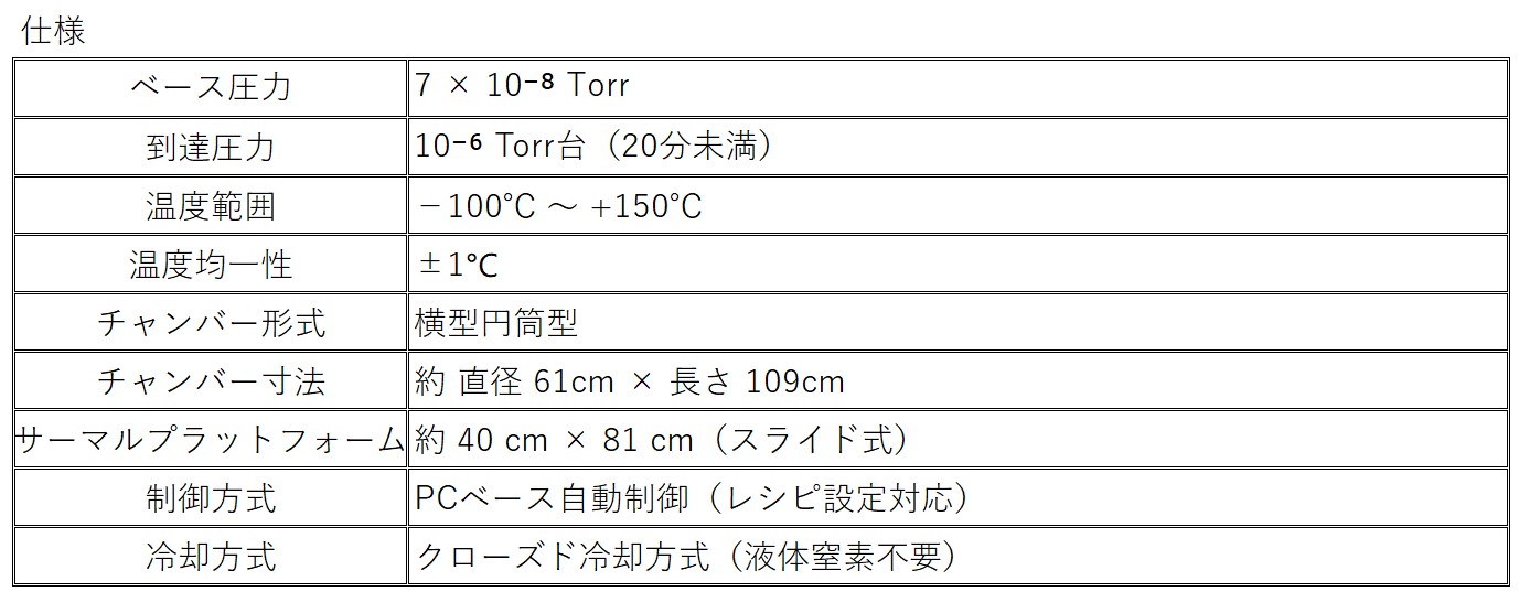 この装置は、小型衛星、宇宙用電子機器、精密部品の熱真空環境評価から信頼性試験まで、宇宙関連開発プロジェクトのさまざまなフェーズでの利用を想定した高機能評価システムです。