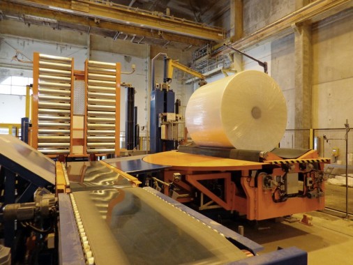 FIS社の原反包装機は高速でフィルムラッピングが可能です。柔らかい家庭紙でも傷つけることなく包装でき、湿度や汚れから原反を守ります。さらにクランプリフトによる搬送時の傷を防ぐことで、損紙の削減にも貢献します。